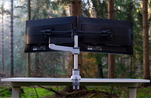 With the R-Go dual monitor arm, you can easily and quickly position your screens at eye level. In addition, you can tilt and rotate the screens as required. The Caparo monitor arms even have an integrated gas spring, allowing you to easily adjust the screens in height and depth with one hand. Ideal for flexible workplaces! Thanks to the modular character, you can easily expand the monitor arms as required with a document holder, laptop holder, smartbar or an extra arm. The monitor arms can be installed from above the worktop. This allows you to work in an upright posture even during installation! In addition, you don’t need any tools for installation. The R-Go monitor arms are designed to be CO2 neutral. The CO2 emissions released when manufacturing a monitor arm are compensated by planting trees. The R-Go monitor arms are designed in the Netherlands and feature patented SMART functions, such as a rotation stop for each moving part. This SMART STOP prevents the monitor arms from colliding with an (acoustic) panel.